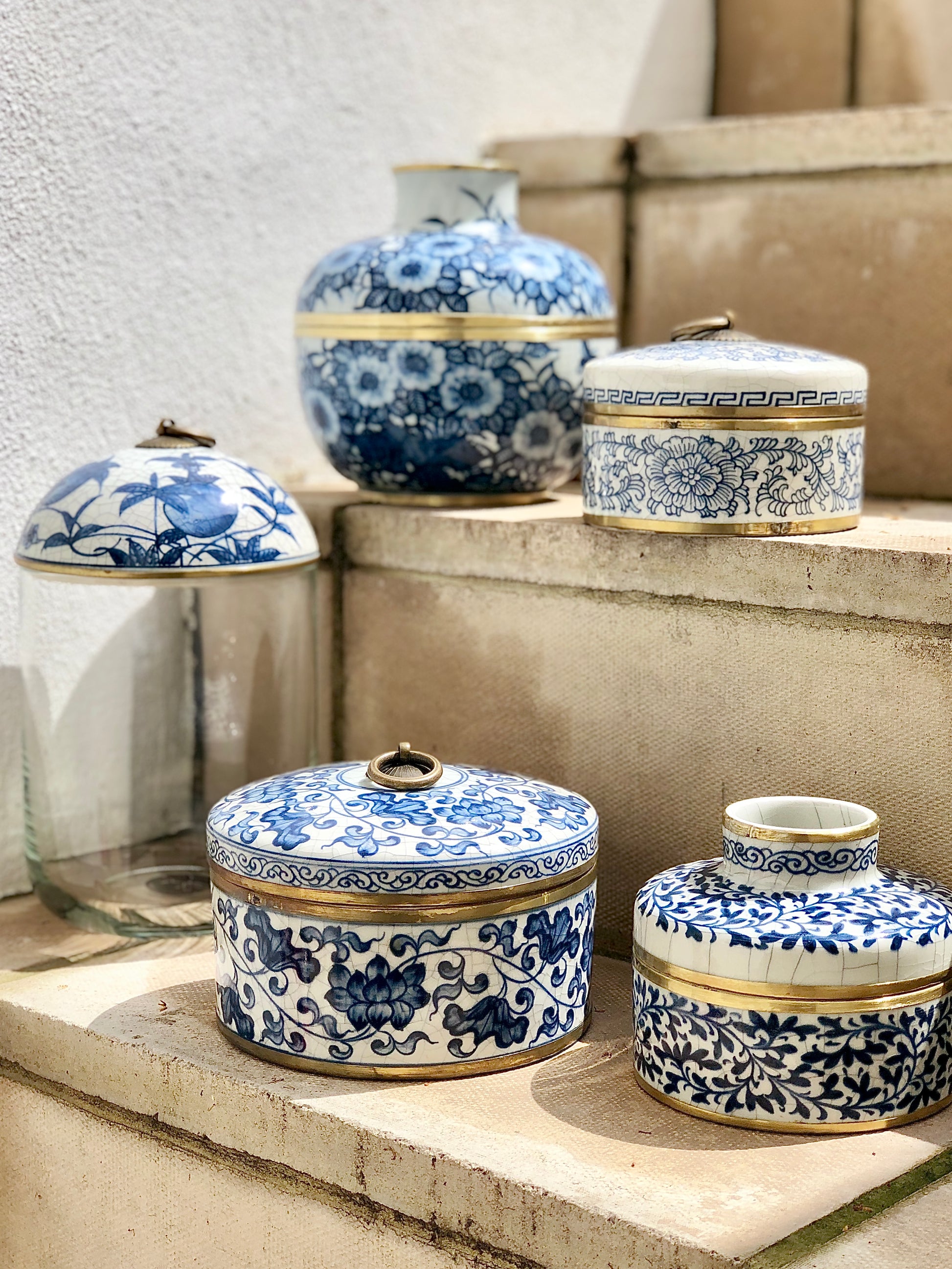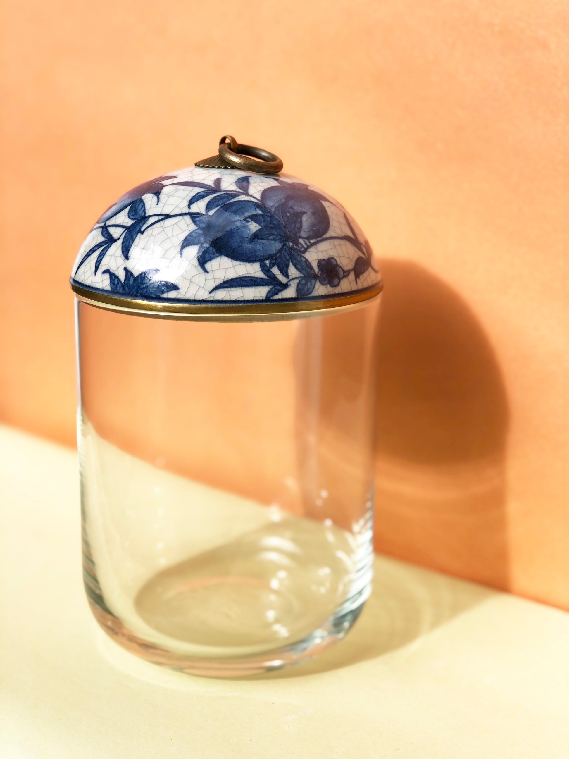 Material/Design: Glass and Ceramic, hand-painted with blue and white motifs, brass detailing.