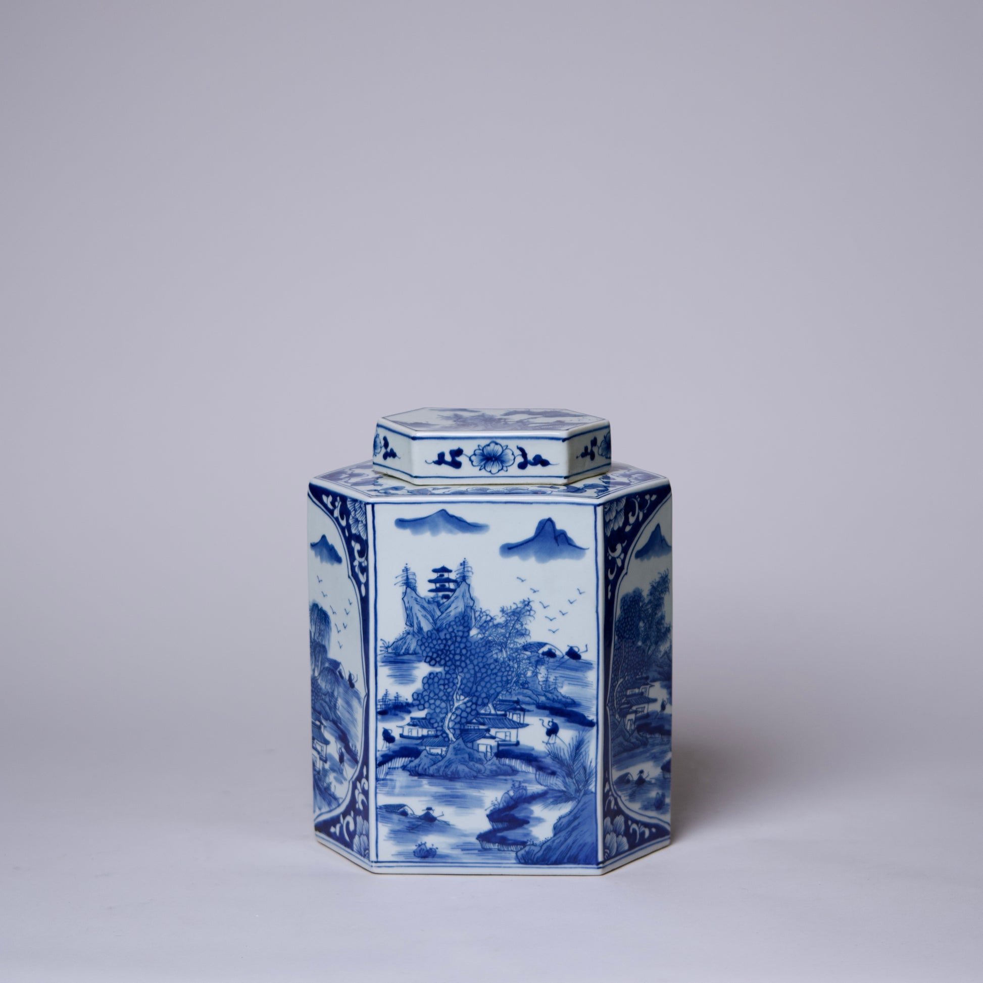 From the 14th century to the present day, Chinese blue and white porcelains have captured the imaginations of collectors everywhere. This piece is a flat-sided hexagonal jar with a cartouche decoration, measuring 10" x 7" x 12".