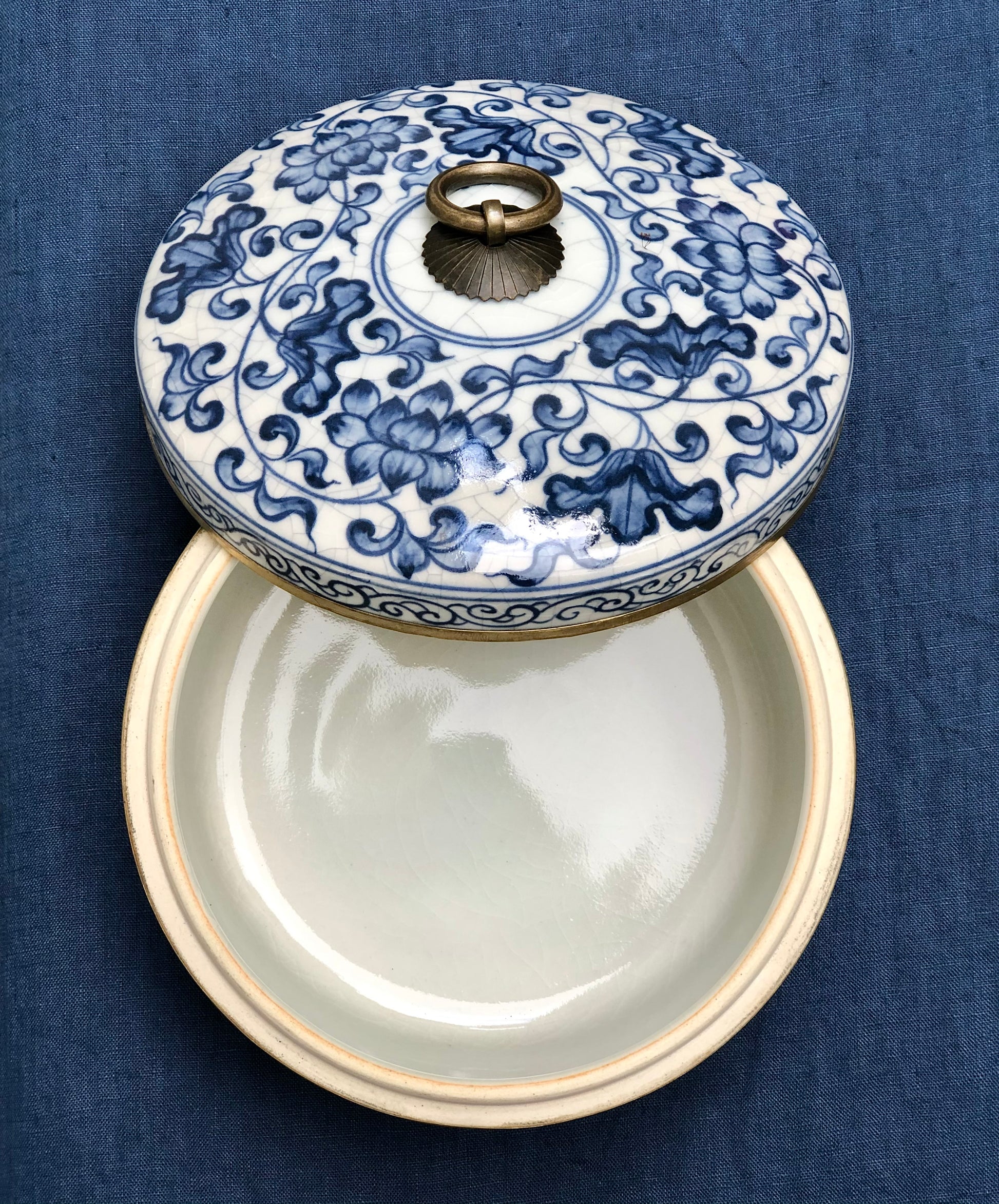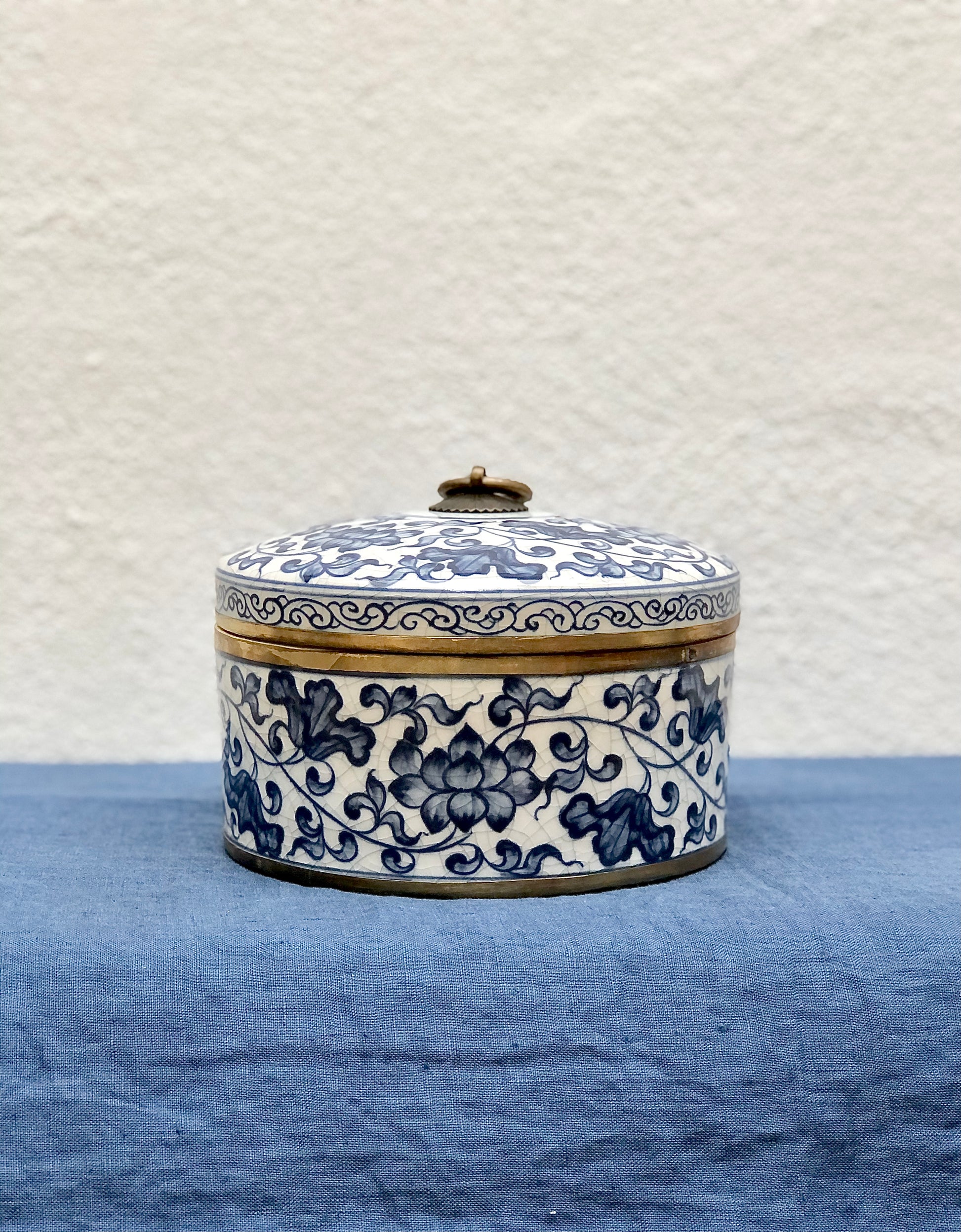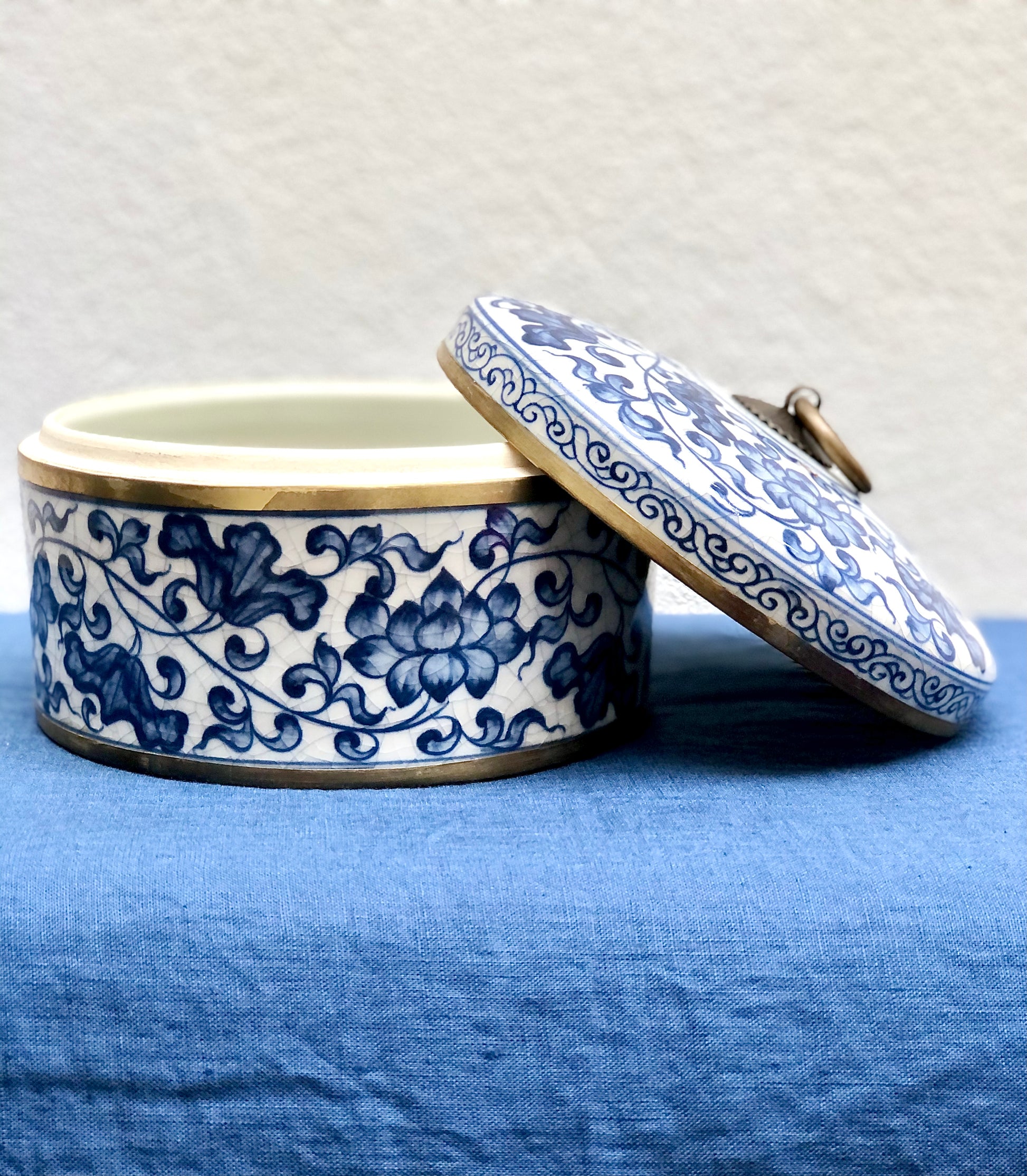 Decorated in a classic blue and white motif with brass details. Handmade and painted by Thai artisans.