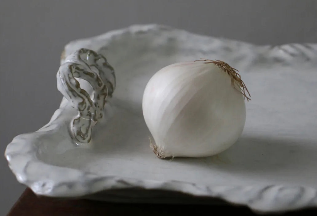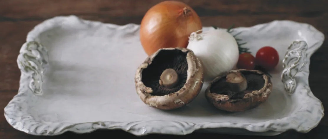 Part of Yarnnakarn's 'Still Life' collection, this tray features an elegant, antique-inspired design with an ornate, sculpted edge. The corners and sides are adorned with intricate, raised detailing that resembles classic baroque styling. The tray's surface is smooth and finished with a glossy glaze, giving it a refined and polished appearance.