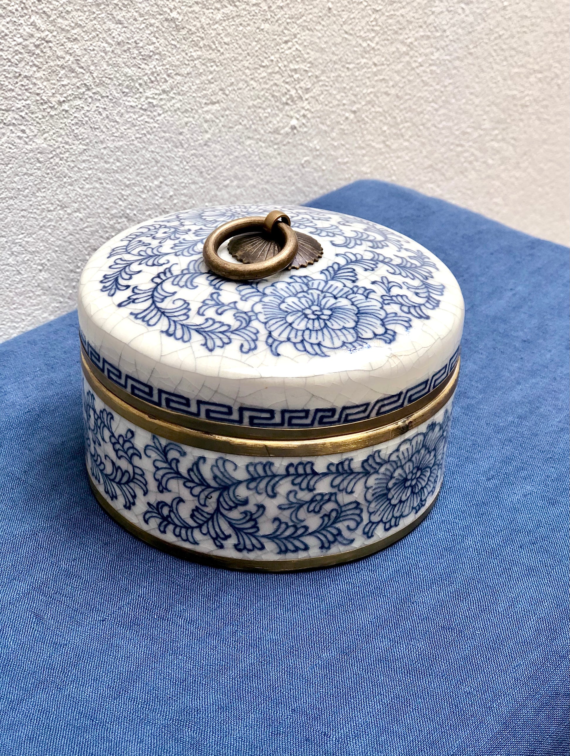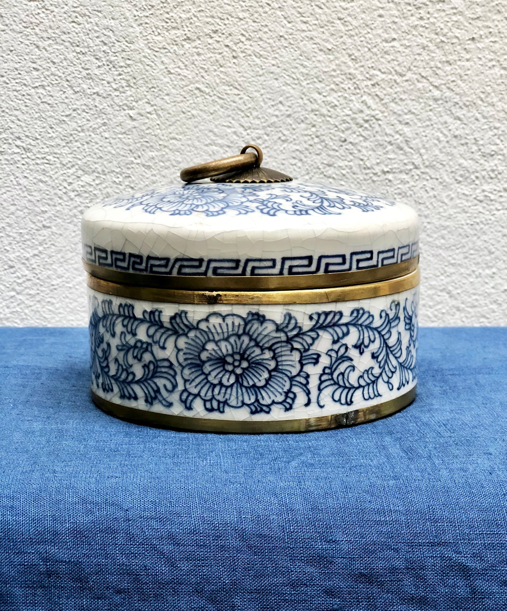 Decorated in a classic blue and white motif with brass details. Handmade and painted by Thai artisans.